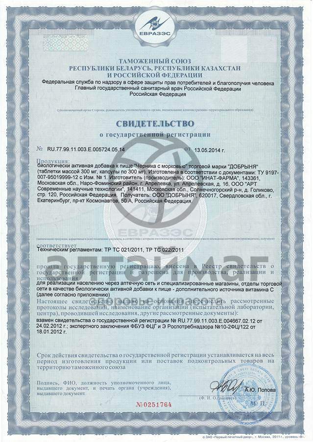 Черника с морковью торговой марки ДОБРЫНЯ применяется в качестве биологически активной добавки к пище - дополнительного источника витамина С.