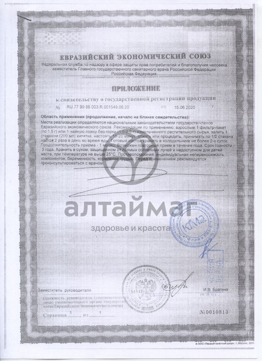 Взрослым 1 фильтр-пакет (по 1,5 г) или 1 чайную ложку без горки (1,5-2,0 г) измельченного растительного сырья, залить 1 стаканом (200 мл) кипятка, настоять 15-20 минут, отжать или процедить, принимать по 1/2 стакана настоя 2 раза в день во время еды. Готовый настой хранить в холодильнике не более 2-х суток. Продолжительность приема - 1 месяц. Возможен повторный прием в течение года.Противопоказания